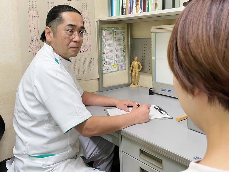 現在のお身体の状況について、詳しくお話をお伺いします。また、施術への不安やご希望があれば伺います。