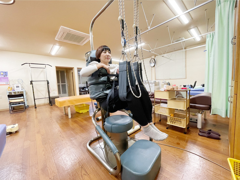 「浮腰式アクティブ運動療法」は、椅子に座ったまま、上半身をベルトでしっかりと抱えて持ち上げることで、腰にかかる負荷を軽減し椎間板をほぐして、腰痛を改善する療法です。
